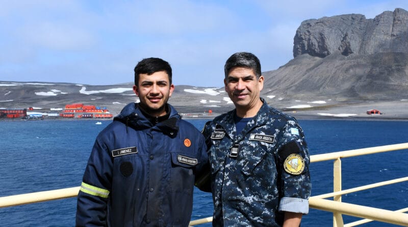 Dos marinos, Suboficial Principal Roberto Alejandro Jiménez y Cabo Segundo Ignacio Agustín Jiménez de Polvorines, Buenos Aires, padre e hijo que se encuentran embarcados en unidades navales que participan de la actual Campaña Antártica de Verano (CAV 2024-2025), lograron encontrarse en Caleta Potter, frente a la Base Antártica Científica Carlini.