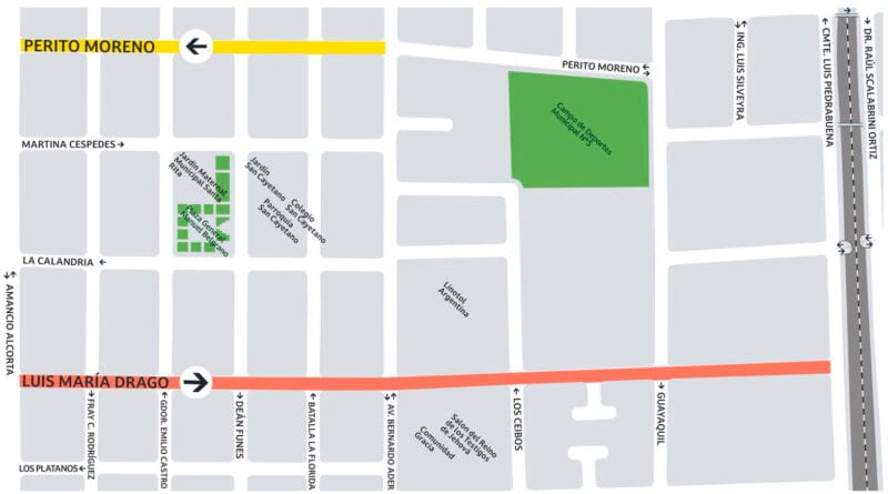 *Se elimina el giro a la izquierda desde Av. Bernardo Ader hacia Luis María Drago en sentido Oeste. Los conductores que deseen dirigirse hacia el Oeste pueden usar las calles Los Plátanos o La Calandria como alternativas. - Perito Moreno : Pasa a ser de sentido único de Este a Oeste en un tramo de cinco cuadras, desde Av. Bernardo Ader hasta Amancio Alcorta. Esta modificación reduce la congestión en las esquinas y mejora la previsibilidad de las maniobras vehiculares. Para quienes circulen en sentido Este, las alternativas son las calles Boedo o Martín Céspedes.