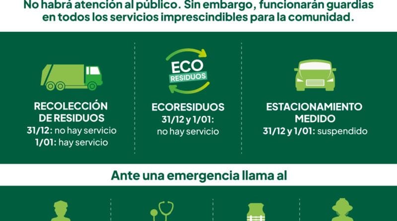 Durante los días 31 de diciembre y 1 de enero, la Patrulla Municipal y los servicios de emergencia funcionarán con normalidad, mientras que otros servicios municipales tendrán horario especial.