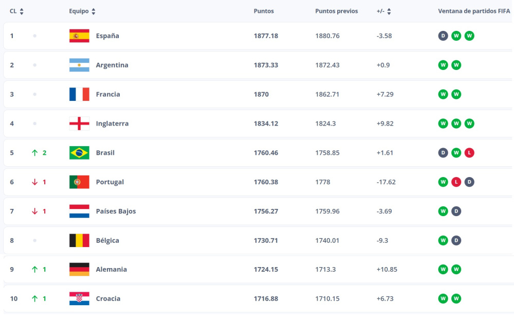 Entre las diez primeras, destaca Brasil (5.ª, +2), que sube dos puestos a costa de Portugal (6.ª, -1) y Países Bajos (7.ª, -1), mientras que la parte negativa la protagoniza Italia (12.ª, -3) que sale del top 10. Baja tres puestos tras la derrota en casa por 1-4 ante Noruega, que con este triunfo confirmó su plaza como una de las 42 selecciones clasificadas para la Copa Mundial de Canadá, México y Estados Unidos.