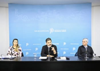 El ministro de Gobierno bonaerense brindó una rueda de prensa junto a la subsecretaria de Salud Mental, Consumos Problemáticos y Violencias, Julieta Calmels, y el secretario de Derechos Humanos del CECIM La Plata, Ernesto Alonso.